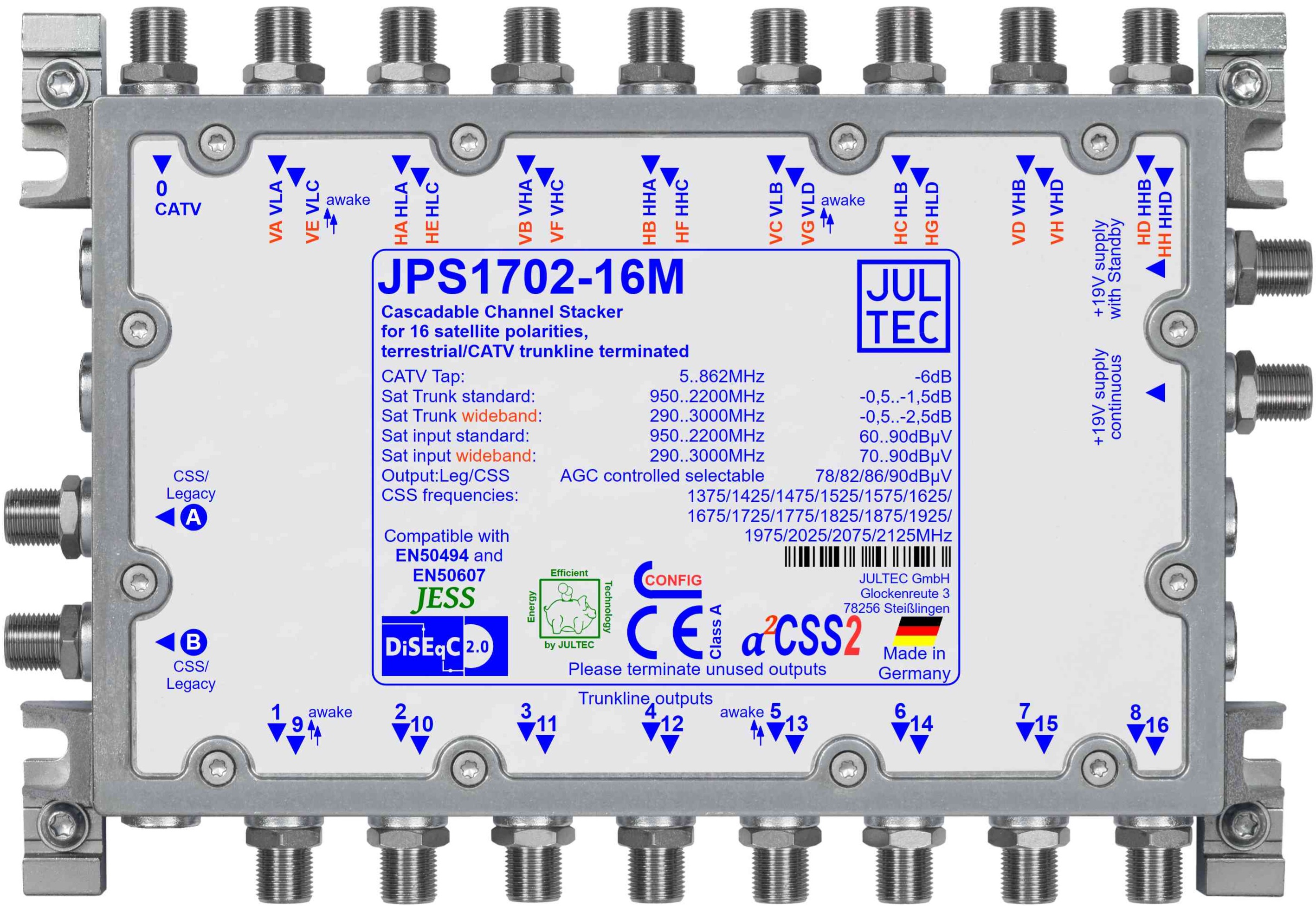 Bei dem Gerät JPS1702-16M handelt es sich um einen Einkabelmultischalter für vier Satellitensysteme (im Breitbandmodus 8 Sat-Systeme). Das Gerät versorgt sich komplett aus den angeschlossenen Empfangsgeräten, für die Speisung der LNBs ist ein externes Netzteil erforderlich (z.B. JNT19-2000).