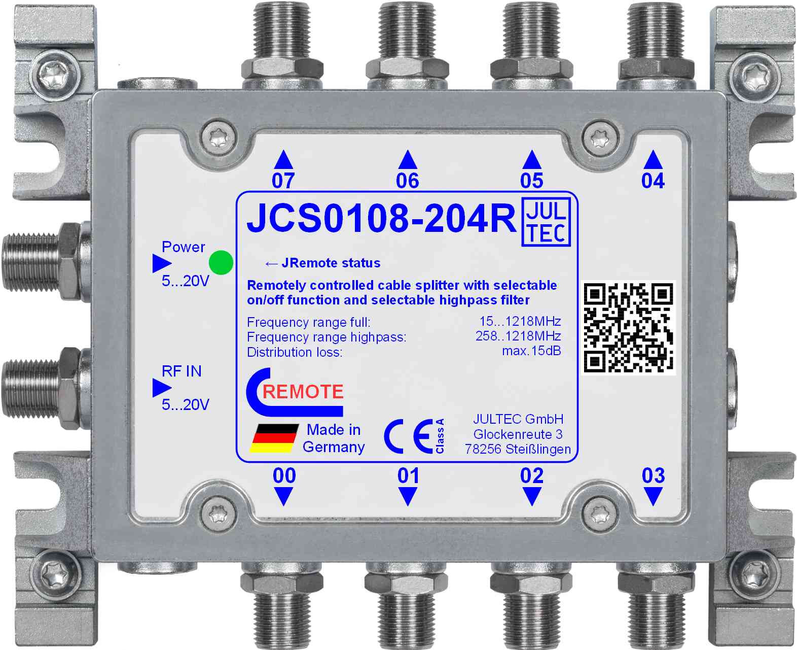 Der Verteiler wird per JRemote gesteuert und dabei über seine Seriennummer adressiert, welche als QR-Code auf dem Gerät abgedruckt ist. Zusätzlich kann diese Seriennummer per JULTEC-Universalprogrammer JAP100 über die Netzteilbuchse ausgelesen werden.